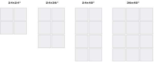 approximately 1” off the wall. Sizes include 24x24, 24x36, 24x48, and 36x48.